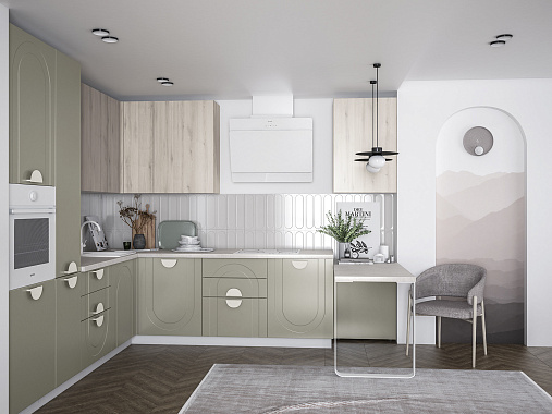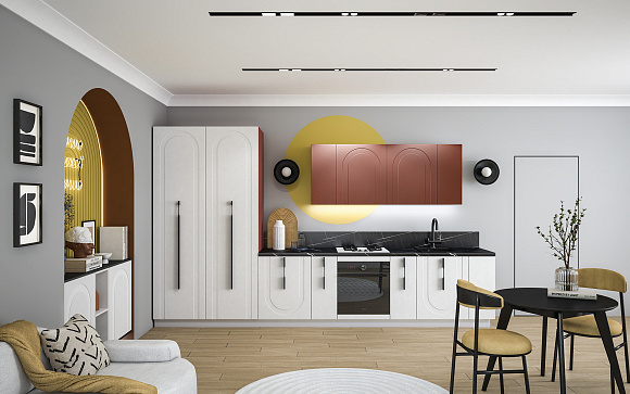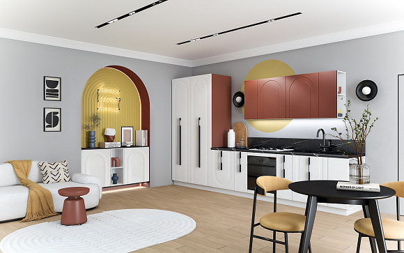 • Арочная фрезеровка фасадов кухни Арко Атриум — не просто декор, а стилистический код, в котором зашифрованы вечная красота и гармония. Её изгибы создают рельеф, в котором играет свет, а тени оживляют поверхность, превращая ее в часть живого пространства. Контрастный терракотовый верх фасадов словно напоминает о закатах над морем, а спокойный матовый низ оттеняет его, создавая баланс и глубину. Кухня становится не только зоной для приготовления еды, но и настоящей архитектурной доминантой интерьера.