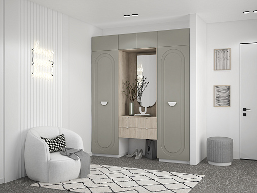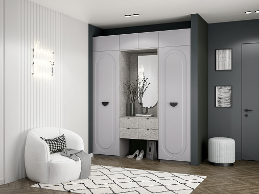 Прихожая Арко — приветствие вашего дома в фирменной эстетике линейки Арко. Два стройных пенала образуют архитектурную раму, а между ними — симметричная парящая тумба на четыре вместительных ящика.