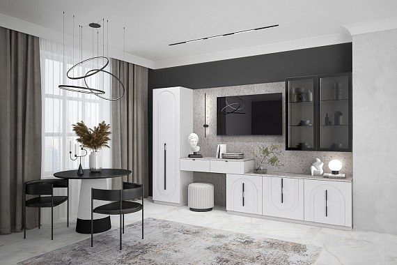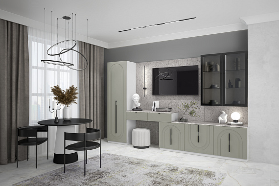 Элегантная геометрия арочной фрезеровки гостиной Арко, благородный кашемировый оттенок фасадов и графичные черные ручки разной длины и на разном уровне привносит в пространство динамику, не давая глазам заскучать. А на стене — декоративная панель с фактурой терраццо, которая подчеркивает строгость и самобытность композиции.