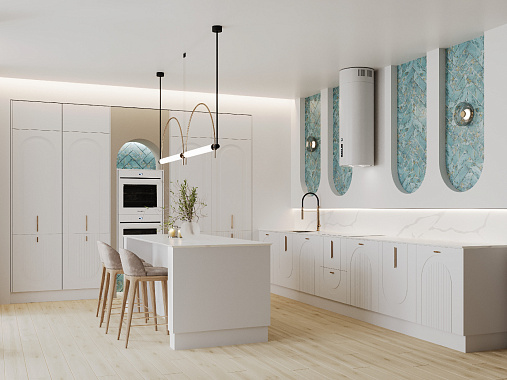 Ведущая доминанта кухни — рабочая зона с исключительно нижними модулями. Арочная фрезеровка на фасадах, направленная и вверх и вниз, придает пространству динамику. Мраморный рисунок на столешнице и фартуке отсылает к древнегреческим храмам, над ним — уложенная елочкой бирюзовая плитка. Элемент фартука? Больше. Это полноценный арт-объект.