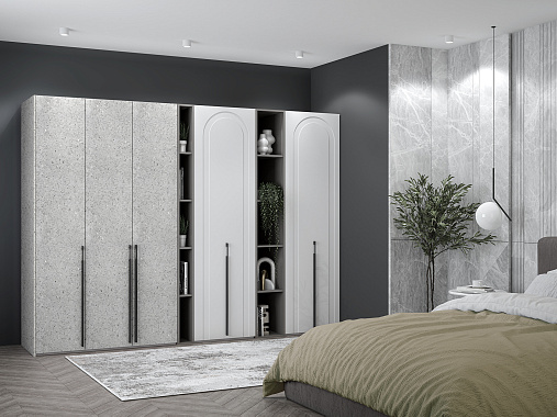 В конструкции сочетаются гладкие и рельефные фасады, а контрастные открытые секции в глубоком графитовом цвете придают композиции глубину. Внутреннее наполнение можно адаптировать под ваши задачи: полки для аккуратного хранения трикотажа, высокие секции для длинной одежды, удобные отсеки для белья, домашнего текстиля и юбок/брюк.
