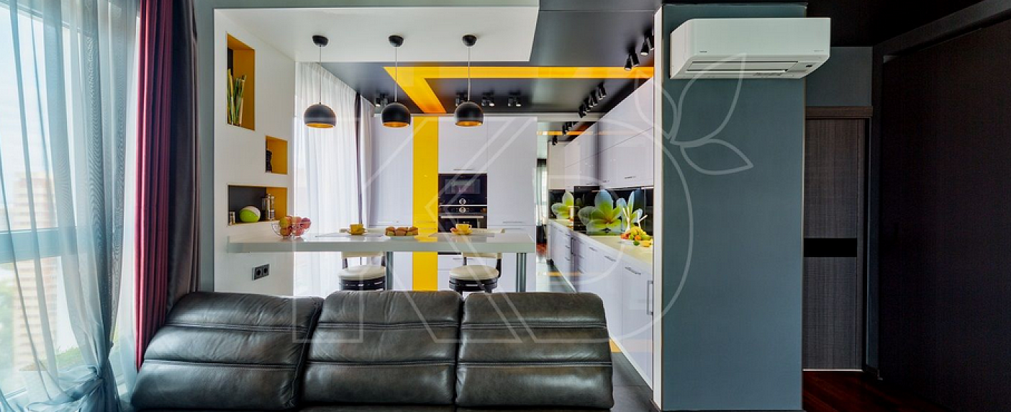 Как правило, гарнитуры с барной стойкой заказывают для довольно больших помещений: просторной, объединенной с гостиной кухни или квартиры-студии. В этом случае мебель размещают таким образом, чтобы стойка проходила по центру и условно делила пространство на две зоны: для отдыха и приготовления пищи.