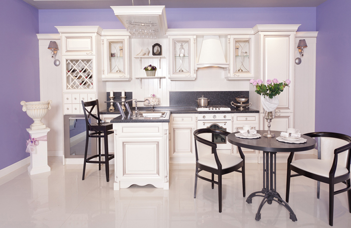 Белая кухня в фиолетовом интерьере