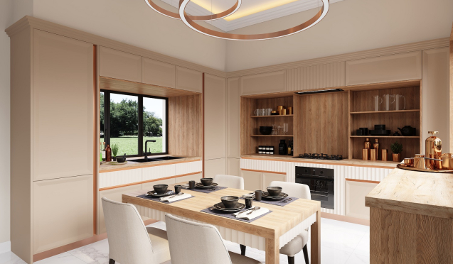 • Широкий ассортимент в каталоге кухонь. В бежевом выполняют классические и скандинавские модели, а также версии в стилях неоклассика, кантри, лофт, хай-тек, минимализм, эко.