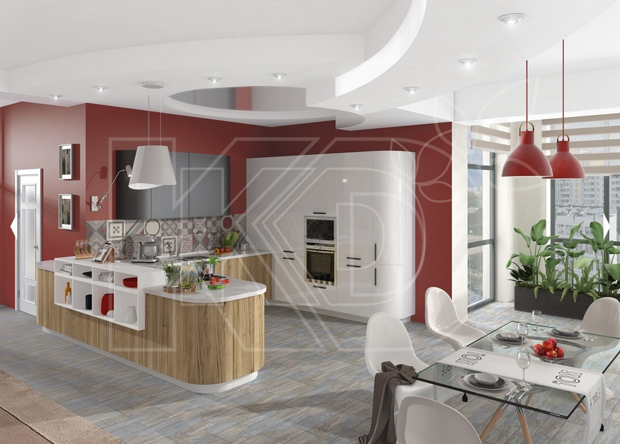 - Просторную кухню с высоким потолком можно визуально уравновесить, создав уютную теплую атмосферу. Здесь допускается использование много коричневого – пол, кухонный гарнитур, шторы, отдельные элементы декора.