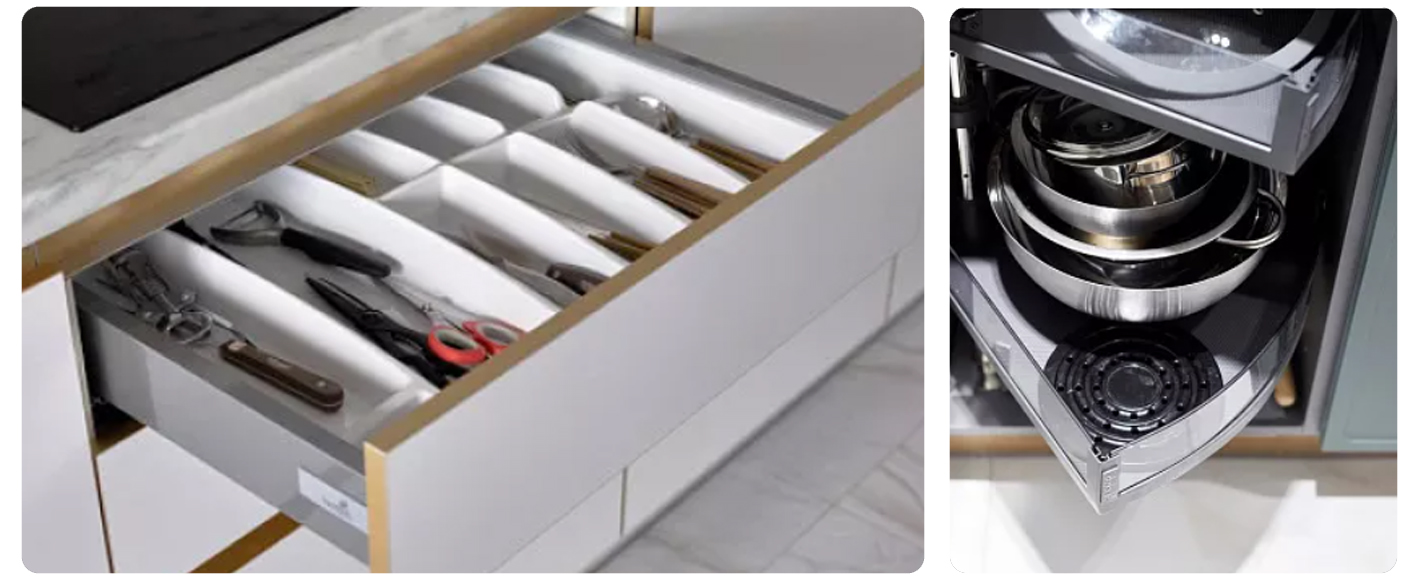 • скрытые разделители — они помогут поддерживать порядок в шкафах, особенно когда речь идет о столовых приборах или специях;