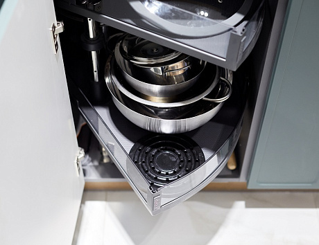 • шкафы с поворотными механизмами — помогут максимально использовать угловые пространства, которые обычно остаются не использованными.
