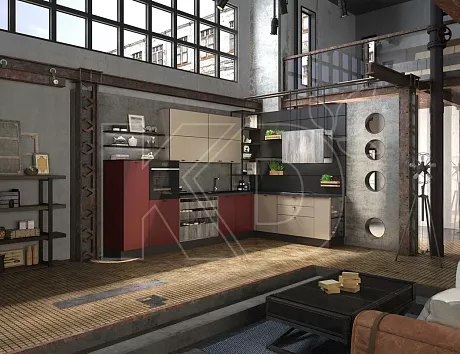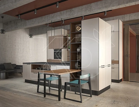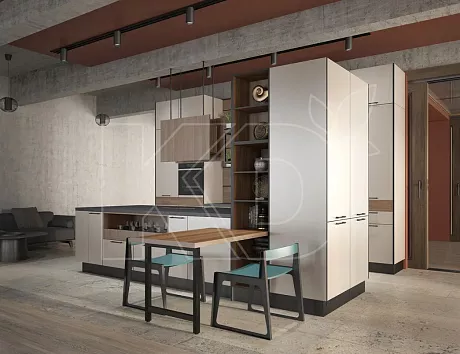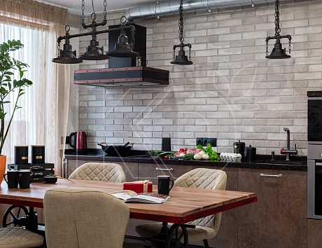 Это два базовых цвета, которые прекрасно друг с другом гармонируют. На сером фоне можно разместить кухонный гарнитур в песочных тонах. Чтобы не переборщить с декором, потолки лучше оставить без отделки, а стены и пол сделать бетонными. Если хочется добавить акцент, то на одной из стен можно сделать кладку из светлого кирпича. Этого будет достаточно.