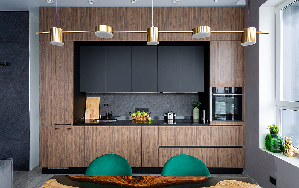 Высокие шкафы-пеналы обычно устанавливают по краям. В них можно спрятать некоторую бытовую технику, а на самые верхние полки убрать предметы, которые используются очень редко.