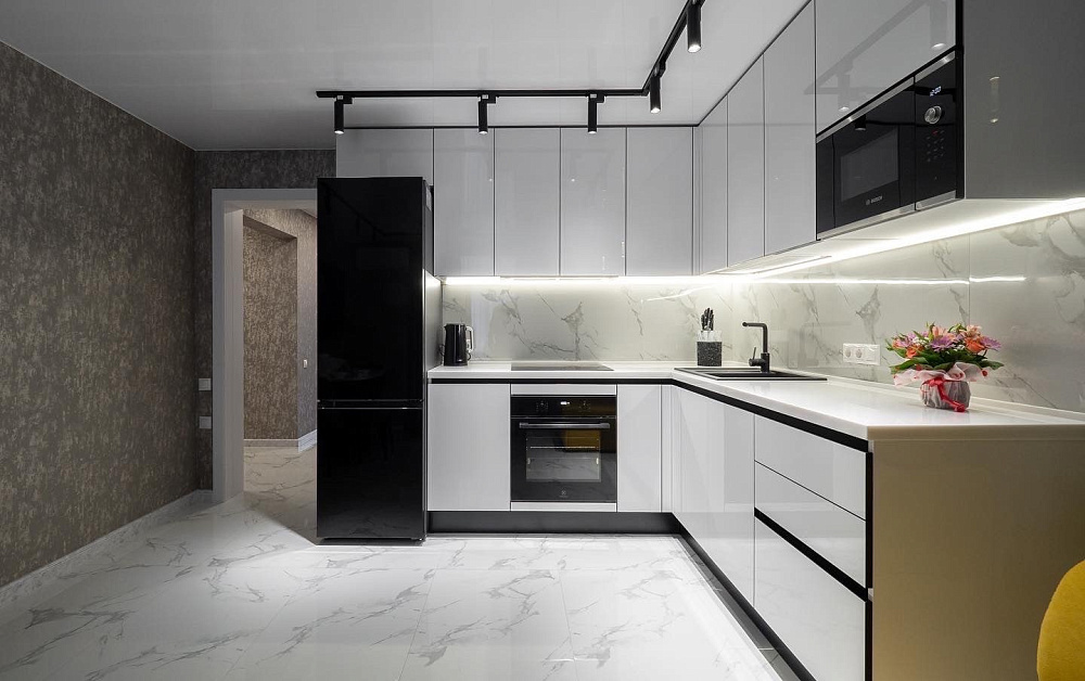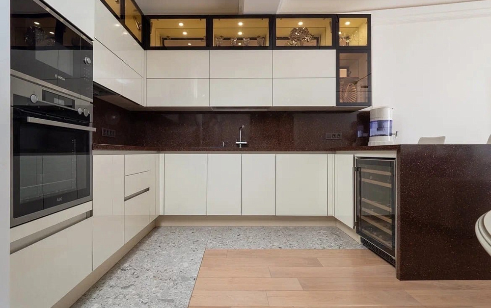 Данное правило в первую очередь касается параллельной и П-образной планировки. Для свободного перемещения между модулями потребуется расстояние 1,2-1,5 метра. В противном случае будет неудобно открывать дверцы шкафов и духовок.