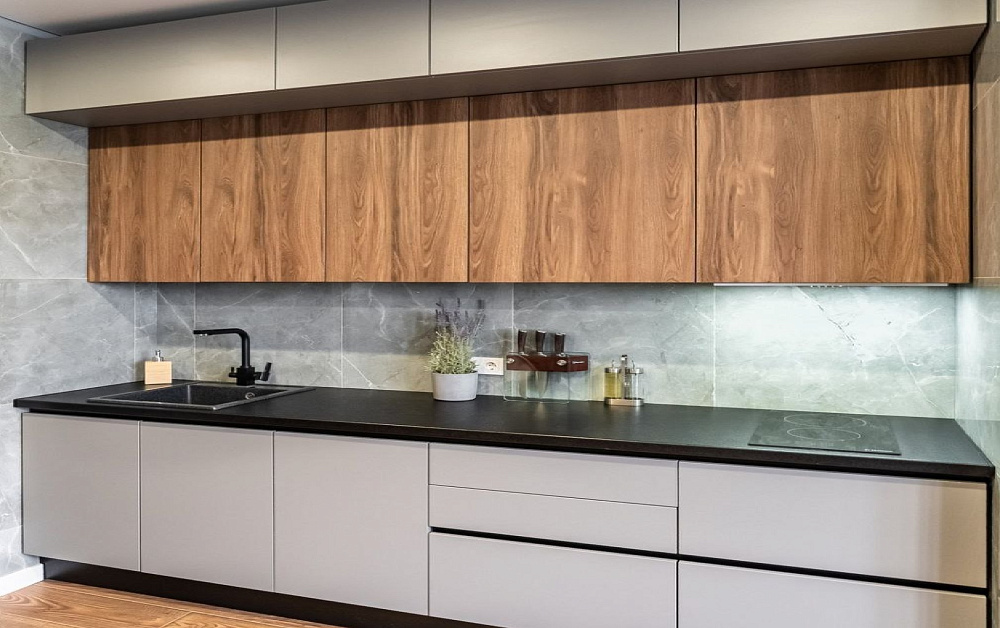 - Линейная. При такой планировке модули расставляют в один ряд возле стены. Это подходящий вариант для небольших комнат, когда важно сохранить каждый сантиметр пространства.