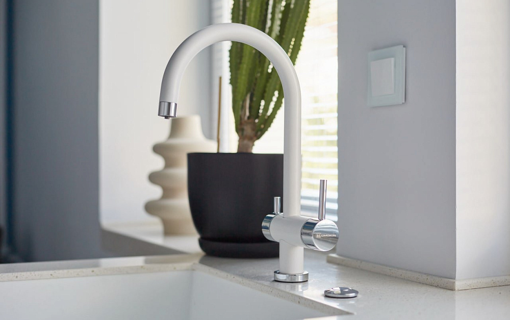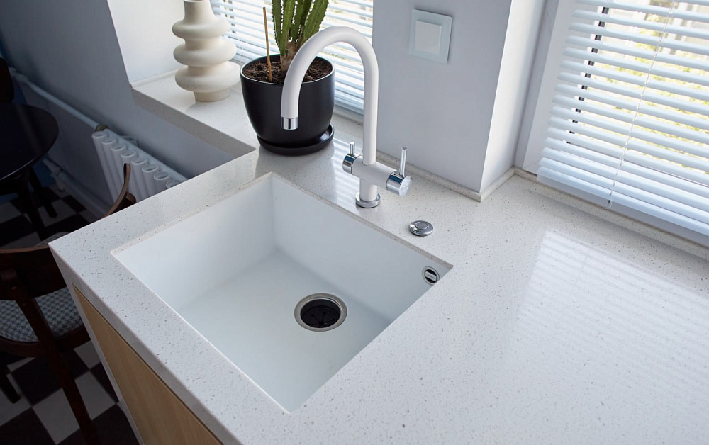 Светлые однотонные фасады можно удачно комбинировать с более темными элементами – цоколями, корпусом и столешницей. И не забывайте про оформление фартука. Необязательно делать его под цвет гарнитуру. Гораздо интереснее, если он будет контрастным или многоцветным.