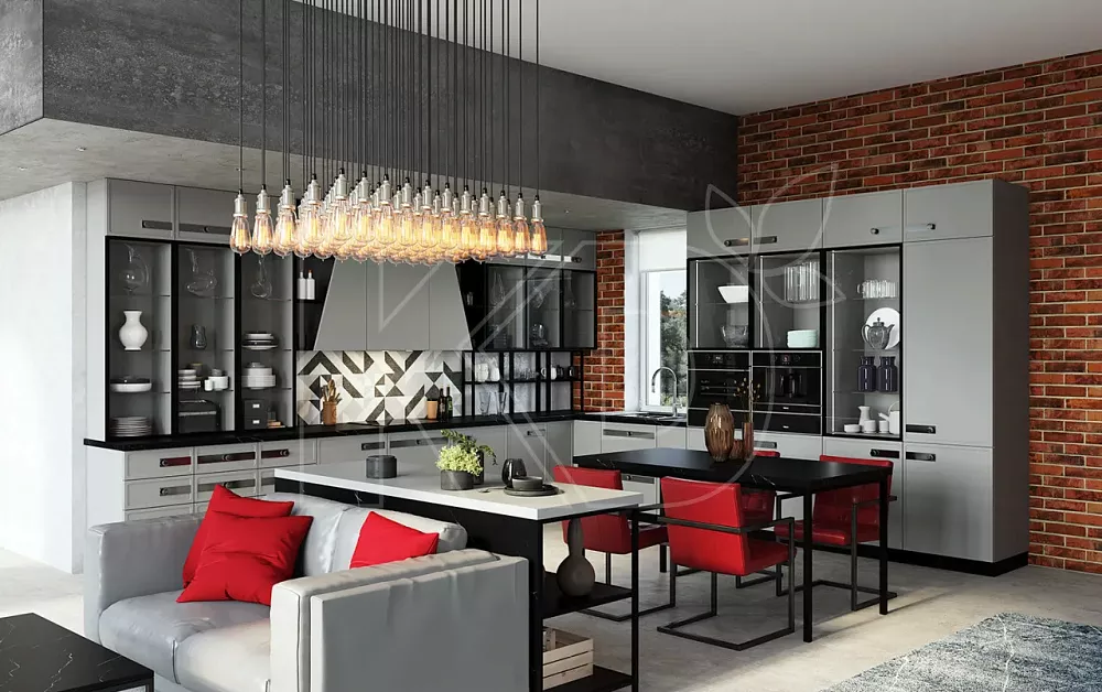 • Сложный свет. С помощью светильников выделяют отдельные зоны, подсвечивают рабочую поверхность и открытые полки.