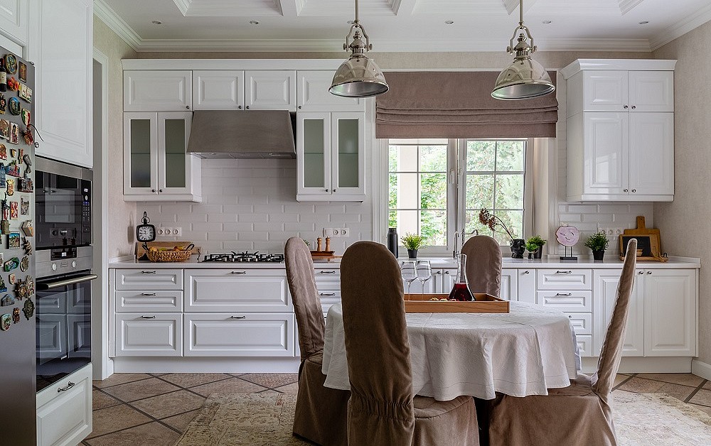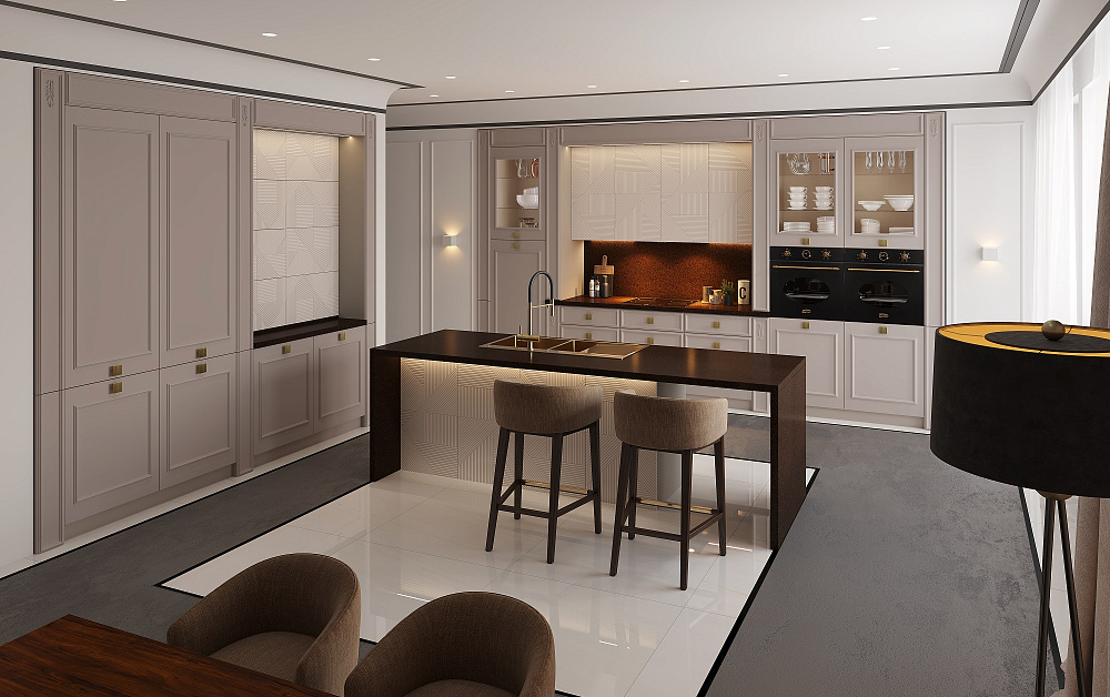 Дизайн кухни в стиле классика привлекает внимание своей роскошью. Для отделки фасадов применяются резные узоры, лепнина, позолота, патина, рамки.