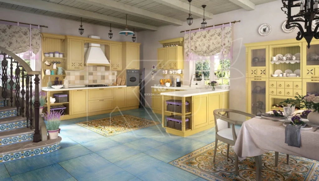 Прованс создает атмосферу спокойствия и тепла. В качестве отделочных материалов в интерьере используется дерево и камень. Для отделки стен применяется декоративная штукатурка и влагоустойчивая краска. Расцветка поверхностей может быть в тон кухонному гарнитуру или светлее. Темные тона использовать нежелательно, чтобы не нарушить концепцию стиля.