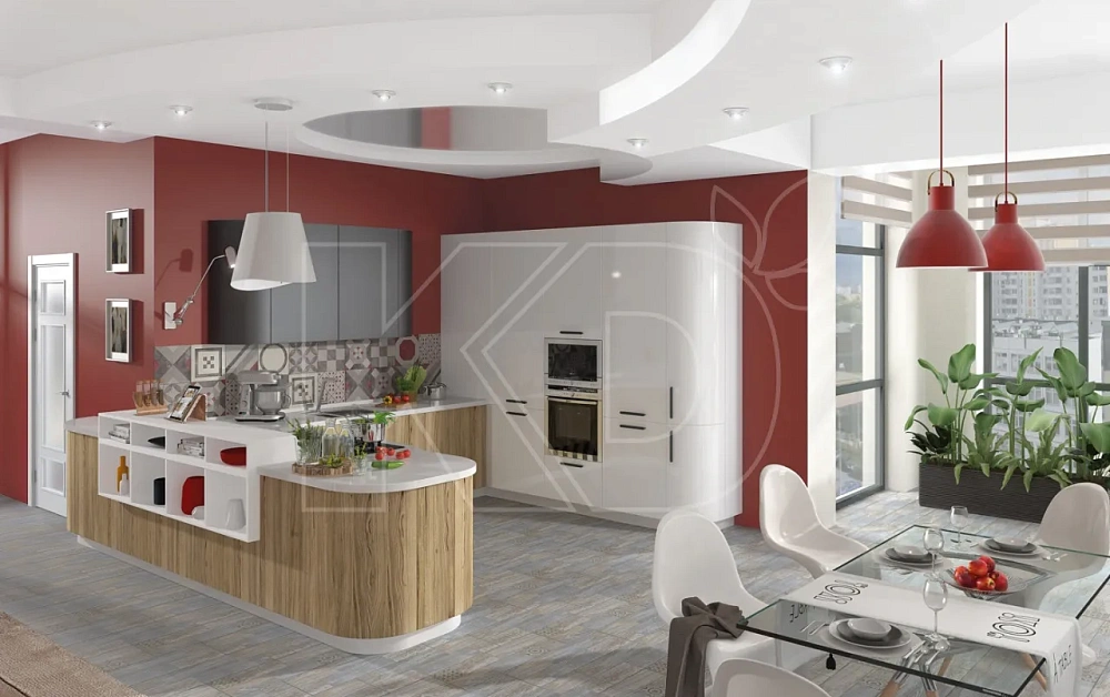 На этапе проектирования определяется не только форма мебели, но и то, чем будет укомплектован кухонный гарнитур. Количество выдвижных ящиков, открытых и закрытых полок выбирается с учетом размеров комнаты и уровня ее освещения.