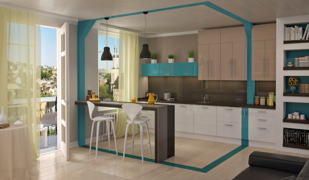 Заказывая гарнитур в квартиру-студию, обратите внимание на островную модель. Данная версия визуально отделит обеденную зону от гостиной. К тому же остров можно использовать вместо обычного обеденного стола.