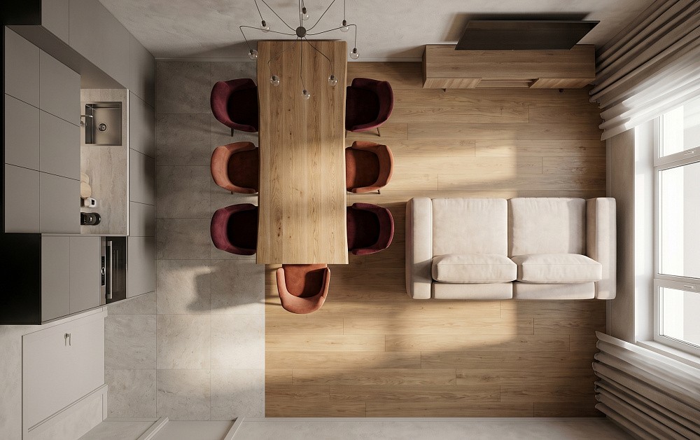 Разделение пола или цвета стен — простой и эффективный способ зонирования: