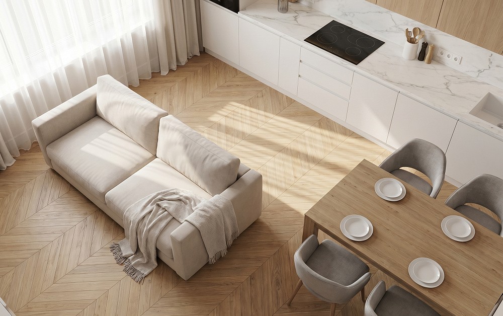 - Разные покрытия для кухни и гостиной (плитка + паркет).