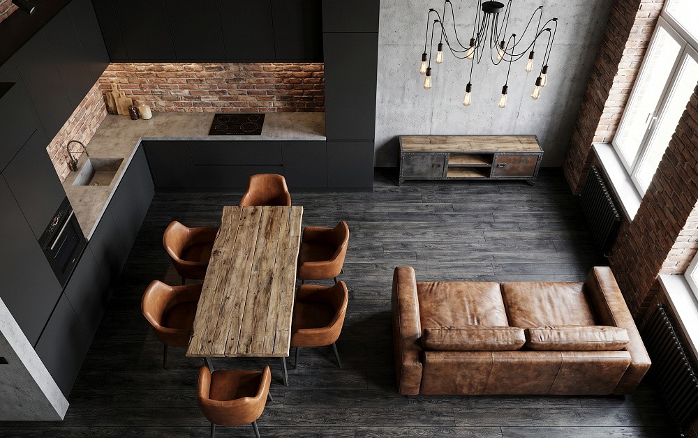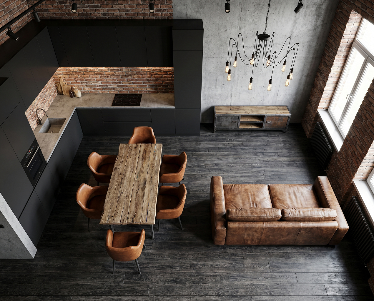 - Лофт — открытые трубы, металл, бетонные поверхности.