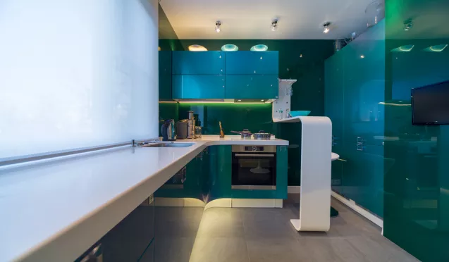 Кухня хамелеон выпускается в разных тонах: бирюзово-лавандовом, сине-зеленом, горчичном и иных. Главным минусом подобной кухни считается завышенная стоимость. В основном гарнитур хамелеон производят под заказ, чтобы он отлично вписался в интерьер.