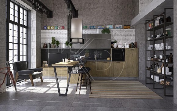 При панорамном остеклении лучше выбрать кухонный гарнитур с высокими вертикальными шкафами, которые следует установить у свободной стены. Рабочую поверхность и мойку можно вынести на островную конструкцию.