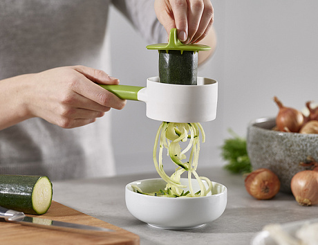 Превратить огурец или морковь в красивые завитки позволяет специальная терка-спиралайзер. А вот нарезать овощи или фрукты одинаковыми ломтиками можно с помощью резака-слайсера.