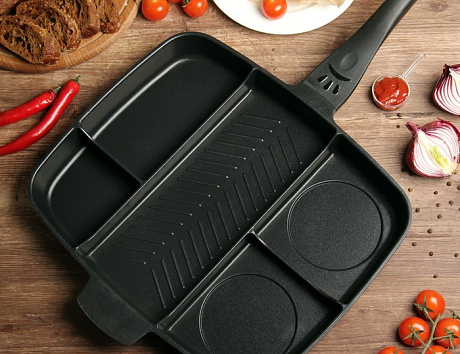 Имея на кухне сковороду-гриль с отделениями можно вдвое сократить время на приготовление завтрака, обеда или ужина. Несколько секций идеальны для одновременной готовки гарнира, яичницы, рыбы или бекона.
