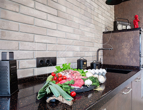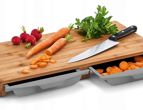 В рабочей зоне будет чистота и порядок, если использовать для нарезки овощей и фруктов разделочную доску с поддоном. Луковая шелуха и другие очистки уместятся в выдвижных контейнерах. В конце приготовления пищи останется выкинуть отходы в мусорное ведро и сполоснуть доску.