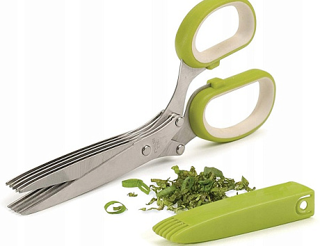 Быстро нарезать зелень можно с помощью специальных ножниц с пятью лезвиями. Чтобы справиться с пучком укропа, зеленого лука или петрушки, потребуется всего пара минут. При этом вам не потребуется доска, ведь нарезку можно осуществлять прямо над блюдом.