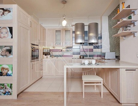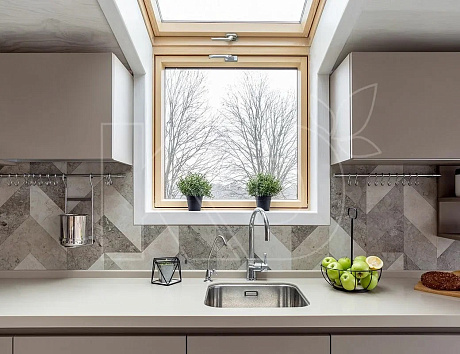 В небольшом пространстве лучше использовать природные материалы. Стены покрасить и отделать панелями из дерева. Полы на кухне уложить массивом, покрыть лаком и покрасить молочной краской. Как вариант – использовать в качестве напольного покрытия керамогранит, имитирующий натуральный камень, или ламинат.