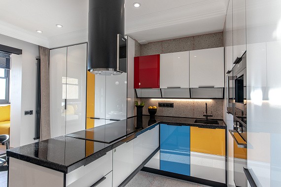 • Свет и цвет! Чем меньше пространства, тем выгоднее использовать светлые фасады и хорошее освещение. А если хочется чего-нибудь оригинального, то пусть фасады будут светлыми, а кромки – чёрными! Например, как в «Мондриане» или «Ханне Блэк»!