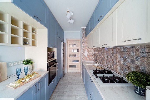 Продвинутый вариант линейной конфигурации – параллельная. Здесь модули кухни располагаются по обеим сторонам от центра комнаты. Такой вариант хорошо подходит для длинных, но узких помещений – они сразу кажутся более просторными. Правда, в этом случае советуем выбирать для фасадов нежные, пастельные оттенки.