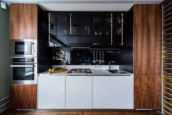 Самый простой в реализации. Здесь нельзя в полной мере воплотить идею «эргономичного треугольника», но в такой конфигурации кухня предстаёт во всей красе. Особенно эффектно смотрится линейный кухонный гарнитур для маленькой кухни, выполненный в ультра- или высоком глянце. При этом помещение должно иметь хорошую инсоляцию и яркое искусственное освещение. Обилие света создаст в глянцевых фасадах игру отражений, что визуально расширит окружающее пространство. А если, напротив, хочется «камерности» и уюта – можно выбрать фасады с натуральной древесной фактурой.
