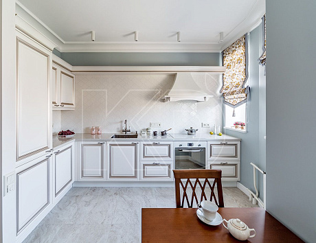 Современная классическая кухня, выполненная в голубых, серых, молочных и черных оттенках, смотрится невероятно стильно и элегантно.