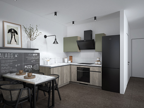 Несмотря на компактные размеры, Уна предлагает максимум удобства: антресольные шкафы увеличивают объём хранения, сохраняя визуальную лёгкость. Фасады мы изготовили из прочной экоплиты EGGER — качественного материала, устойчивого к воздействию влаги и механическим повреждениям. Все элементы продуманы до мелочей, чтобы кухня оставалась эргономичной, удобной и приятной в использовании на многие годы.