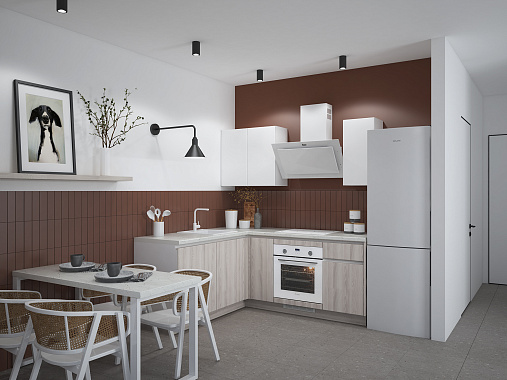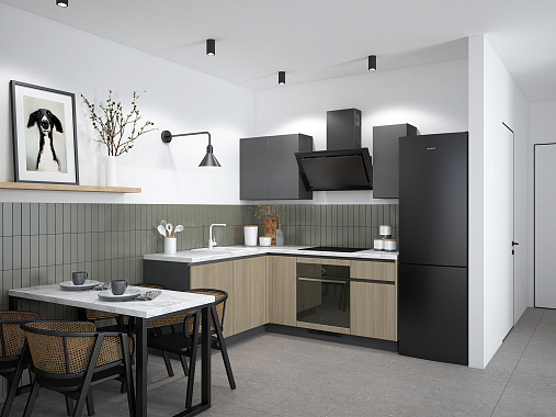 Особенность модели — выразительное двухцветное исполнение. Матовые однотонные фасады сочетаются с фактурой натурального дерева, создавая уютную и сбалансированную композицию. Такой дизайн делает кухню универсальной: она легко впишется в любой интерьер — от скандинавского до современного минимализма.