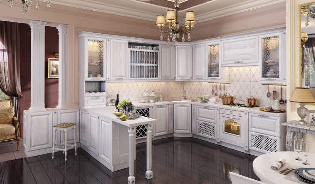 За основу дизайнеры взяли ниши, перегородки и совмещенные территории. Кухни классика – основа стиля, на которую можно посмотреть с другой стороны таким образом: середина кухонного помещения освобождена, гарнитур установлен в виде «перевертыша» (боком) у стены.