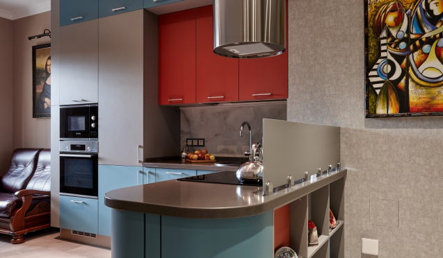 На кухне с полуостровом мультиварку, тостер, микроволновку, чайник и прочие мелкие, но нужные приборы расставляют по углам либо сдвигают на края гарнитура. Такая организация пространства смотрится стильно. Кроме этого, у каждого предмета появляется свое место.