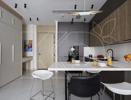 Довольно часто встречаются гарнитуры в стиле сканди с элементами в темных цветах. Например, черными столешницами и навесными полками. Подобные варианты смотрятся очень эффектно. Несмотря на наличие темных деталей, в них сохраняется воздушность и невесомость.
