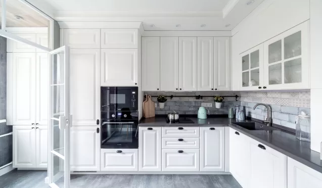 1. Самыми эффектными кухнями на 2023 год считаются модели с контрастным сочетанием блоков, выполненные из экологичных материалов в комплектации фасадов из МДФ и экомембраны со стилизацией под светлое и темное дерево.