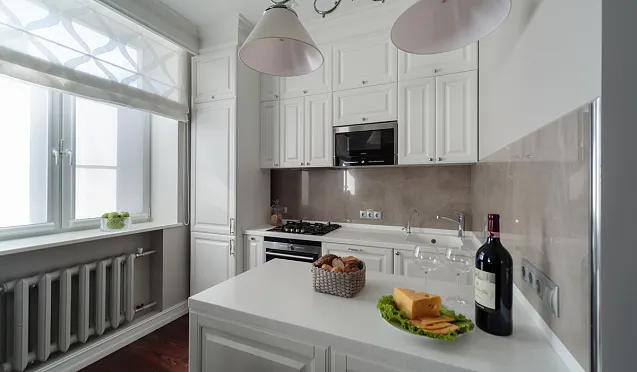 • Более авангардные решения, в которых на фасадах мебельного гарнитура применяются вставки из натурального дерева или белые блоки – смотрятся более свежо в любой обстановке вне зависимости от степени освещенности. Они понравятся почитателям стилей прованс, эклектика и модерн.
