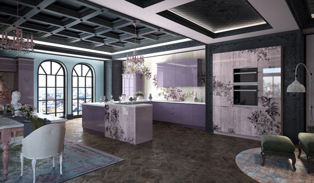 Более темные, например, фиолетовые кухни с глянцевым покрытием подойдут для большой площади. Такие модели выглядят эффектно и необычно. При наличии дополнительной подсветки они смотрятся еще привлекательнее.