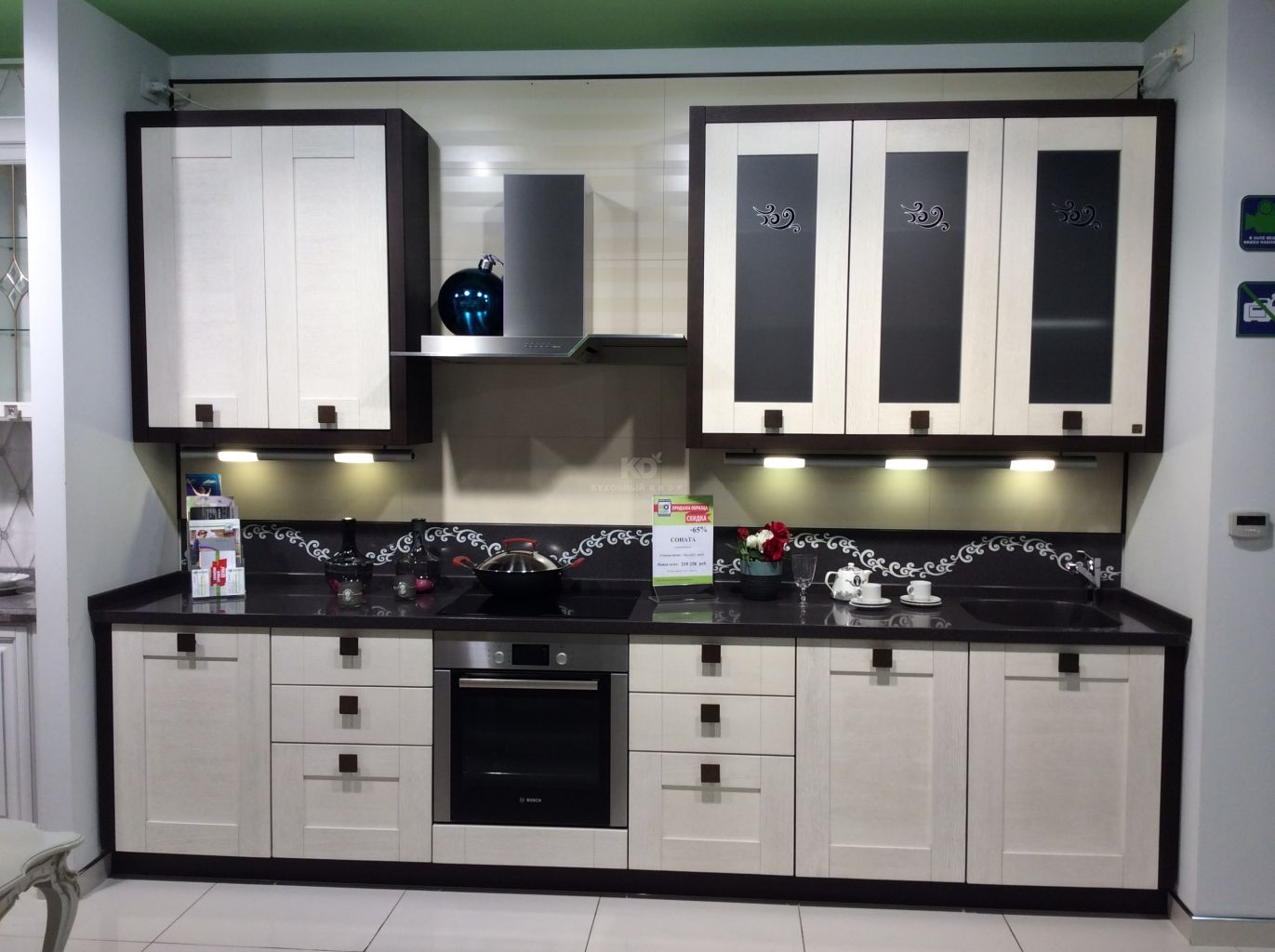 В данную стоимость входит: мебель, столешница из акрилового камня с литой мойкой, стеновая панель из акрилового камня с инкрустацией, ручки, витражи.