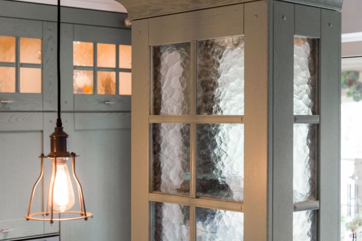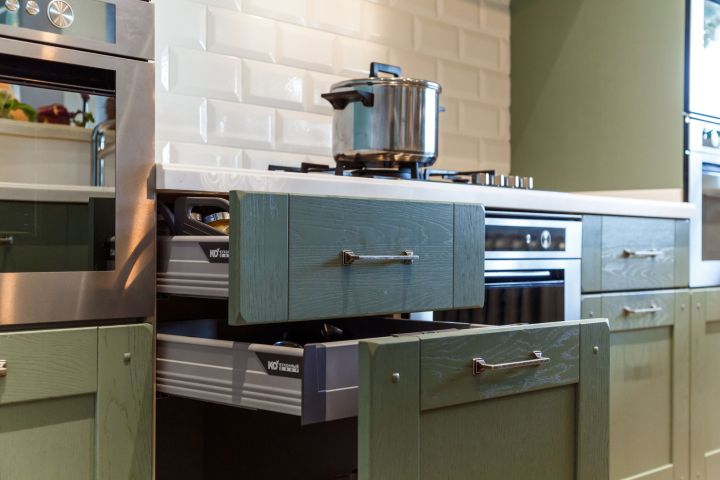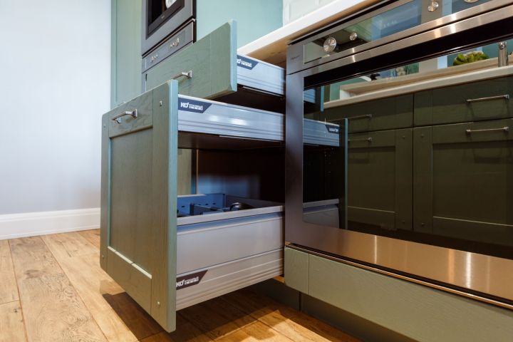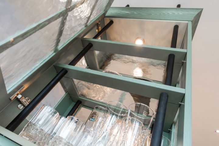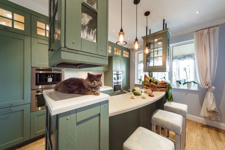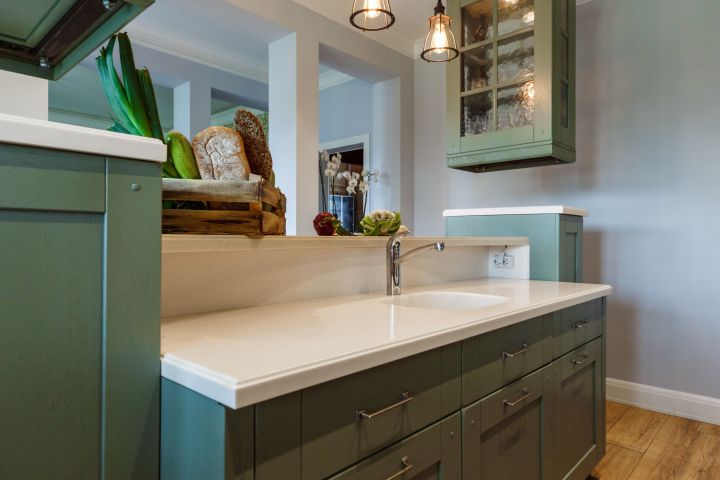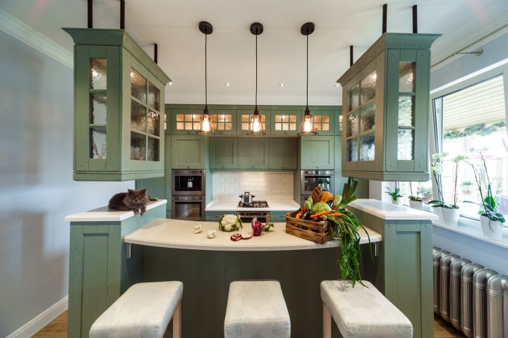 Столешница и интегрированная литая мойка с декоративной кромкой изготовлены из искусственного камня белого цвета. Столешница острова бежевого оттенка и изогнутой формы – так гораздо удобнее для общения. Кухонный гарнитур пепельно-зеленого цвета разбит на две части – основную рабочую зону с техникой и остров-барную стойку с мойкой. . Мебель выполнена из древесно-стружечных плит с ламинацией. Основная рабочая зона представляет собой линейную композицию, в центре которой находятся варочная поверхность, духовой шкаф и встроенная вытяжка. Полки для посуды и кухонной утвари расположены в два ряда: весь верхний ряд антресолей – со стеклом, нижний ряд – с глухими фасадами и меньшей глубины. Дубовые рамки немного стесаны по углам и украшены деревянным гвоздиками, как будто их сделали не на производстве, а сколотили вручную. Все ящики и шкафы оснащены доводчиками, ручки – цвета «античное серебро». На кухне предусмотрено много эргономичных систем хранения. Ящики оснащены мобильными держателями для тарелок и специй, разделителями для хранения посуды и столовых приборов, отсеками для мелочей, держателями для ножей, фольги и пищевой пленки. Под духовкой находится двойной ящик для сковородок – теперь ставить друг на друга их не придется, и покрытие не повредится. Остров объединяет барную стойку, мойку, высокие напольные шкафы и самые интересные предметы гарнитура – подвесные модули-витрины. Четыре стержня пронизывают парящие шкафы насквозь, делая конструкцию надежной и безопасной. Шкафы напоминают огромные старинные фонари с рельефным стеклом на фасадах. Справа от мойки скрывается посудомоечная машина, с другой стороны – вместительная сушка и отделение для хранения столовых приборов. Барная стойка позволит комфортно разместиться и быстро перекусить.